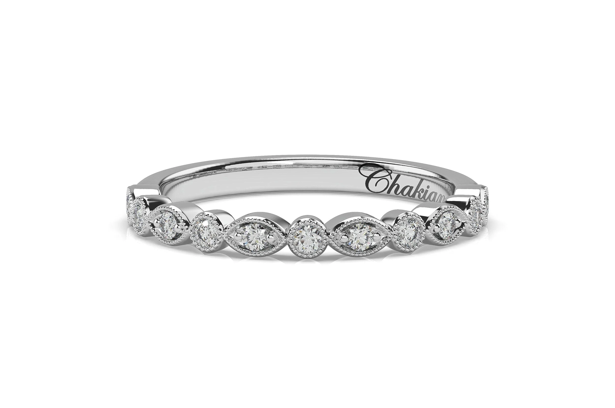 Elegant, intricate, and timeless — Elara is where vintage romance meets contemporary design. This enchanting diamond band features eleven round brilliant diamonds set in alternating marquise and round-shaped bezels, each edged with delicate milgrain detailing for a soft, antique-inspired finish.